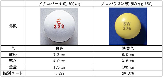 薬剤を別のジェネリック医薬品に変えた場合をシミュレーションしよう。メチコバール錠 500μg をメコバラミン錠 500μg「SW」に変えると下記に示すように、錠剤の大きさや色が相違しており、十分に区別可能となる。