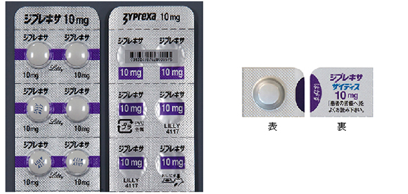 図.「ジプレキサ錠 10 mg」の PTP 包装の 6 錠(左)と「ジプレキサザイディス錠 10 mg」の PTP 包装の 1 錠(右)